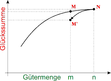 Wenn man Güter gleicher Art erwirbt, weil jedes nächste Gut Freude bereitet, wird die gesamte Freude eine ansteigende Kurve ergeben. (Wenn man zugleich auch die Sättigung der Bedürfnisse berücksichtigt, steigt diese Kurve ebenfalls, aber immer langsamer.) Wir betrachten jetzt den Zuwachs an Freude oder Glück von M auf N, der entsteht, wenn der Besitz an Gütern sich von m auf n vergrößert. Was passiert aber mit dem Gesamtglück, wenn der Besitzer einen Verlust erleidet, so dass sein Besitz wieder auf den früheren Stand n zurückfällt?