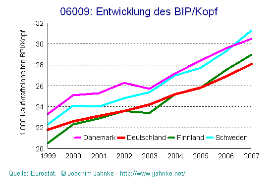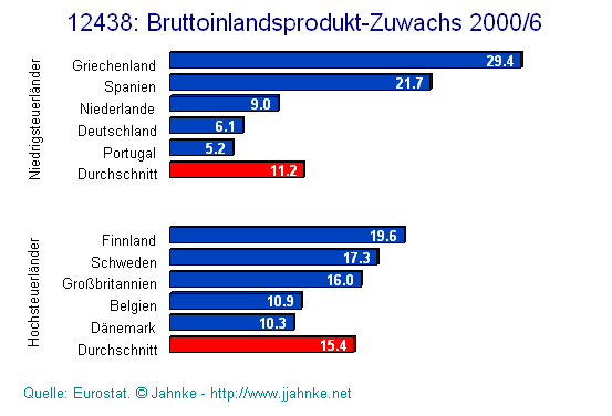 Es kommen einem fast die Tränen bei so viel Aufopferung und Gütigkeit der Unternehmer. Wie sieht es aber mit den Tatschen aus? Nach der Theorie sollte die Wirtschaft in den Niedrigsteuerländer schneller wachsen als in den Hochsteuerländern. Schauen wir uns die europäischen Länder an. Zu den fünf mit den niedrigsten Steuerquoten gehören Griechenland, Deutschland, Spanien, Portugal und Niederlande. Zu den fünf mit den höchsten Steuerquoten gehören Dänemark, Schweden, Finnland, Belgien und Großbritannien. Ein Vergleich der Wirtschaftsentwicklung von 2000 bis 2006 zeigt, dass sich die Hochsteuerländer im BIP pro Kopf mit 15,4 % erheblich besser entwickelt haben als die Gruppe der Niedrigsteuer-Länder mit 11.2 %