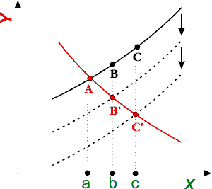 Auf dem rechten Diagramm haben wir zur Vervollständigung einen anderen Fall gezeigt. Hier besagt die Theorie: Wenn x steigt, dann steigt auch y. Die angeblichen zusätzlichen Faktoren - die nicht vorsehbar oder rein zufälliger (stochastischer) Natur sein könnten - verschieben diesmal die Linie nach unten, so dass die theoretische Aussage weiterhin richtig bleibt, auch wenn die tatsächlichen Ergebnisse das Gegenteil ergeben: die rote Linie -A-B’-C’- fällt anstatt zu steigen.
