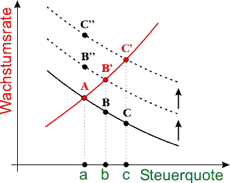 Hat man - trotz aller Ermahnungen und Beschwörungen der Experten - noch einmal die Steuern erhöht und das Ergebnis (C’) hat wieder einmal die Theorie Lügen gestraft, dann stellt man wieder eine neue Verschiebung der Kurve „durch unvorhersehbare Strukturänderungen“ fest, und die Theorie stimmt wieder. Und das Spiel kann man beliebig lange fortsetzen. Obwohl also die Tatsachen eindeutig zeigen, höhere Steuerrate bedeute höheres Wachstum (die rote Linie -A-B’-C’-), sei die gegensätzliche Aussage der Theorie nicht widerlegt, sondern bestätigt. Diese Erklärung hat auch der Zauberlehrling Hoppe im Sinne, die er dann noch eindrucksvoll in seine rhetorische Frage eingewickelt.